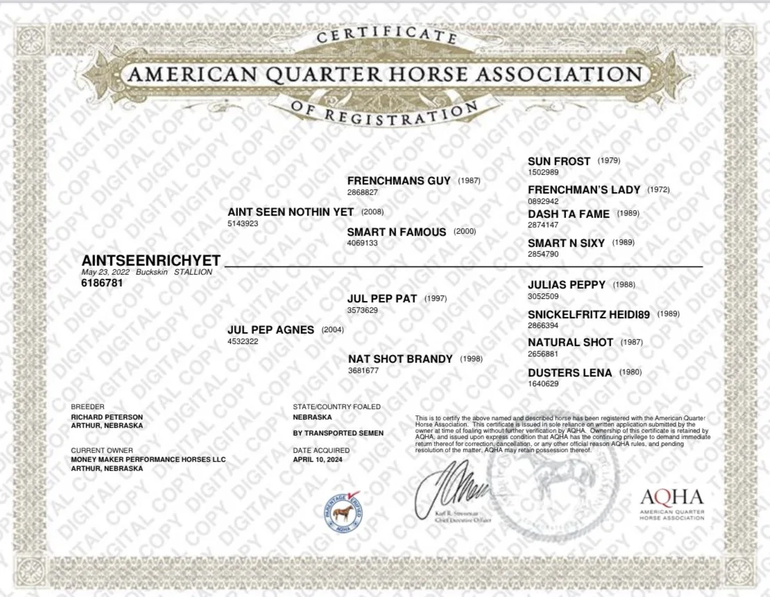 Interested in breeding your mare with our stallion AintSeenRichYet? Fill out our quick submission form outlining how we can best serve you.